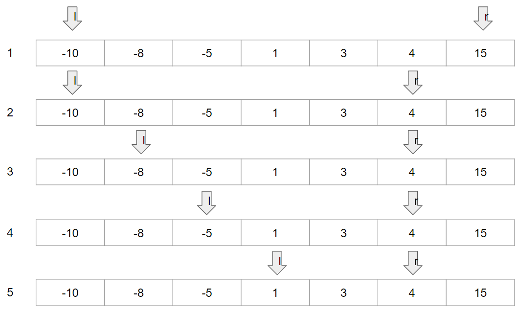 2. l과 r의 합이 -6 이므로 l을 하나 뒤로 옮겨준다. 이때의 합의 절댓값 6은 5보다 크므로 기억해둘 필요는 없다. 이런식으로 진행하다보면 4에서 저장된 -5와 4의 합의 절댓값이 끝까지 살아남게 된다.